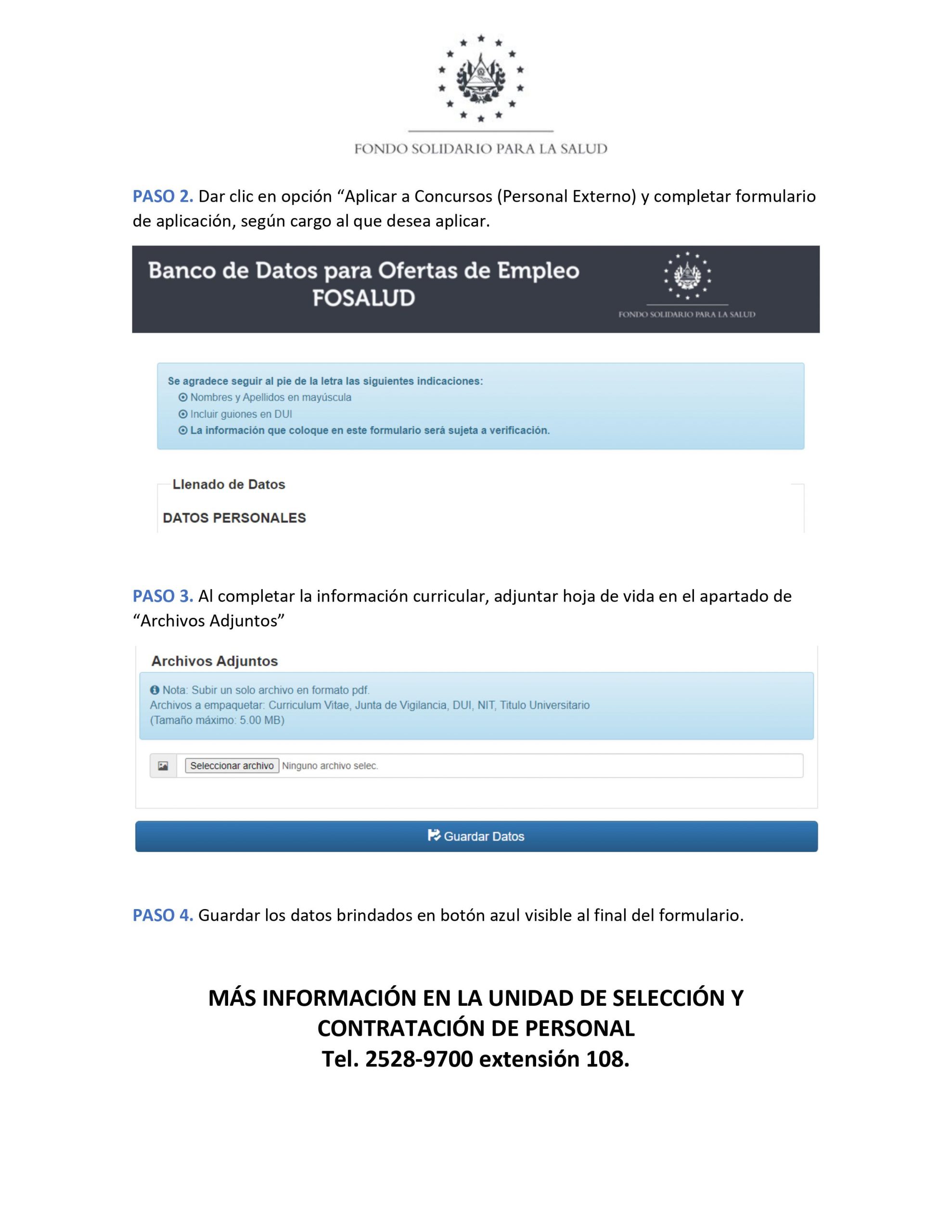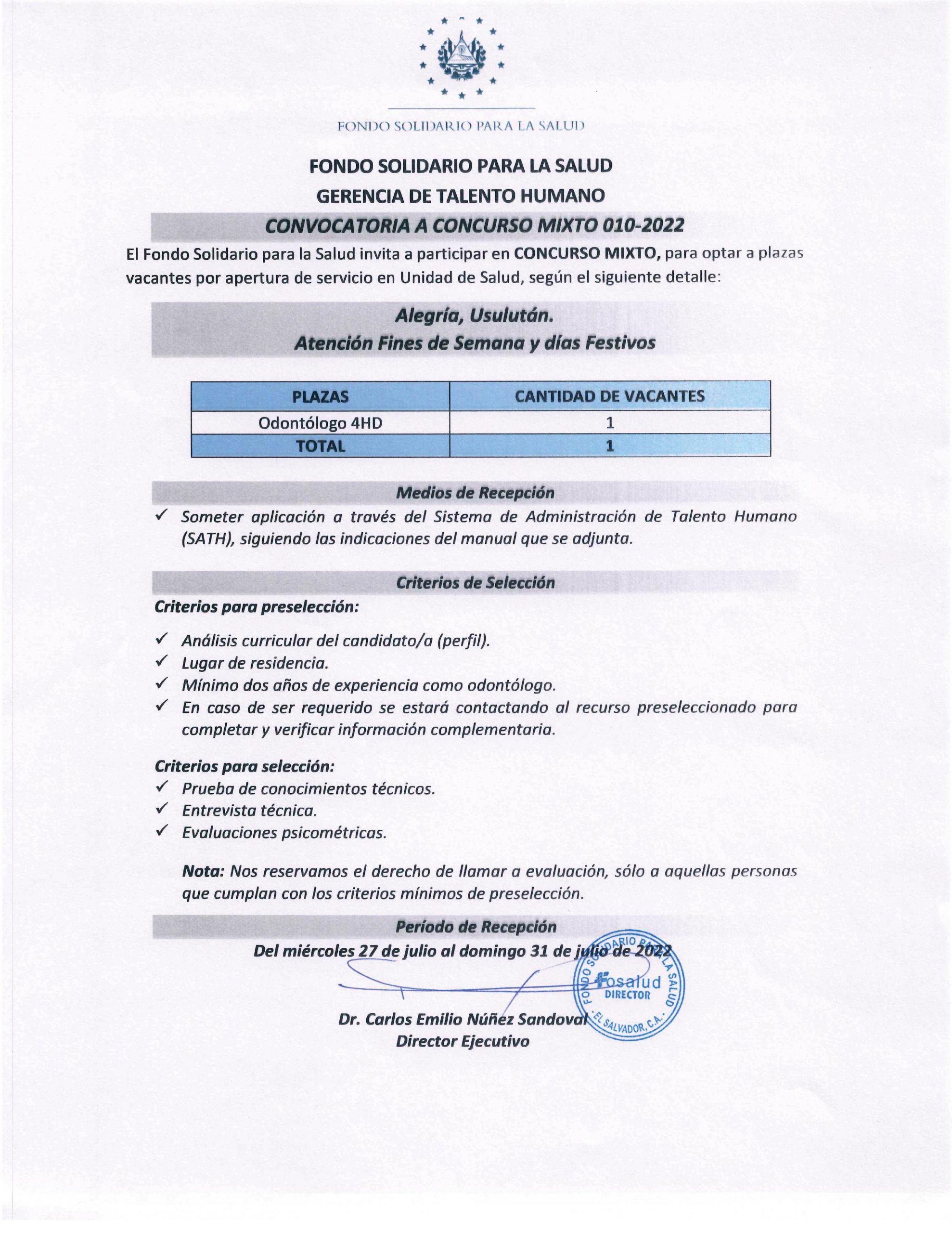 El Fondo Solidario para la Salud invita a participar en CONCURSO MIXTO, para optar a plazas vacantes por apertura de servicio en Unidad de Salud de Alegría, Usulután. Ver información completa en el siguiente documento: